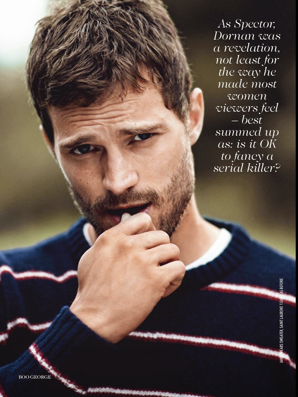 But this is not why we’re here – as Dornan is at pains to emphasise, giving short shrift to the suggestion of a Vogue editor that he might, perhaps, peel off his top? Last year Dornan surprised everyone – not least himself – by being cast as the lead in the hit BBC Series The Fall as Paul Spector, a bereavement counsellor, husband and father, who spends his evenings creeping into Belfast bedrooms and murdering defenceless women, a role he reprises for the show’s second season, debuting this month. As Spector, Dornan is the sleekest predator imaginable, all honed muscle tone and knicker-sniffing depravity, and the perfect foil to Gillian Anderson’s superbly alluring whip-smart detective Stella Gibson. For Dornan, it was a career-defining role, delivering him a Bafta nomination – and into the big time. Earlier this year he was cast as Christian Grey, in the film adaptation of Fifty Shades of Grey.“The Fall changed by life – that’s not an overstatement,” he says.